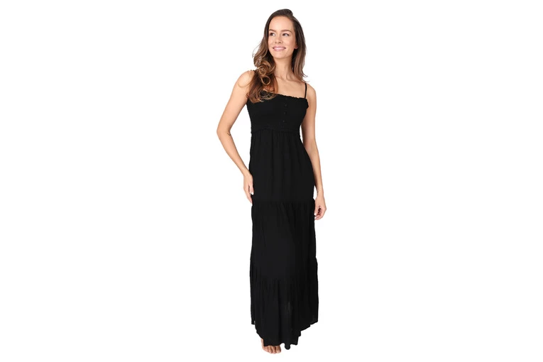 Deze maxi jurk van viscose heeft een gesmokte bovenkant met kleine knoopjes aan de voorkant en een opening op de rug. De bandjes zijn verstelbaar.