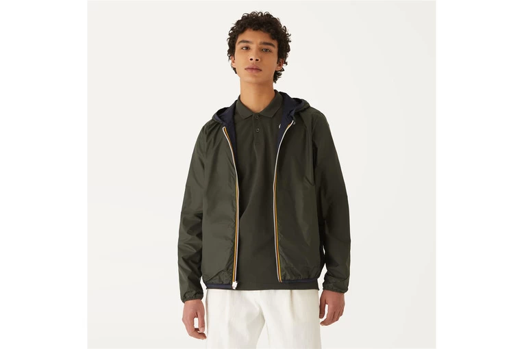 Volledig omkeerbare K-Way, twee zijden in lichte nylon. Waterdicht, ademend en winddicht. Deze K-Way heeft gelaste naden, een capuchon en twee zijzakken.
