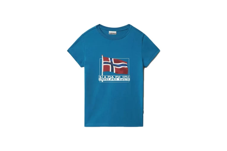 Dit T-shirt geeft een leuke draai aan de iconische print van de Noorse vlag en weerspiegelt klaar en duidelijk de kenmerkende stijl van Napapijri. Dit praktische T-shirt met ronde hals leent zich perfect voor jonge waaghalzen op zoek naar avontuur. Met ribboorden en korte mouwen is het een echte must-have voor dit seizoen.